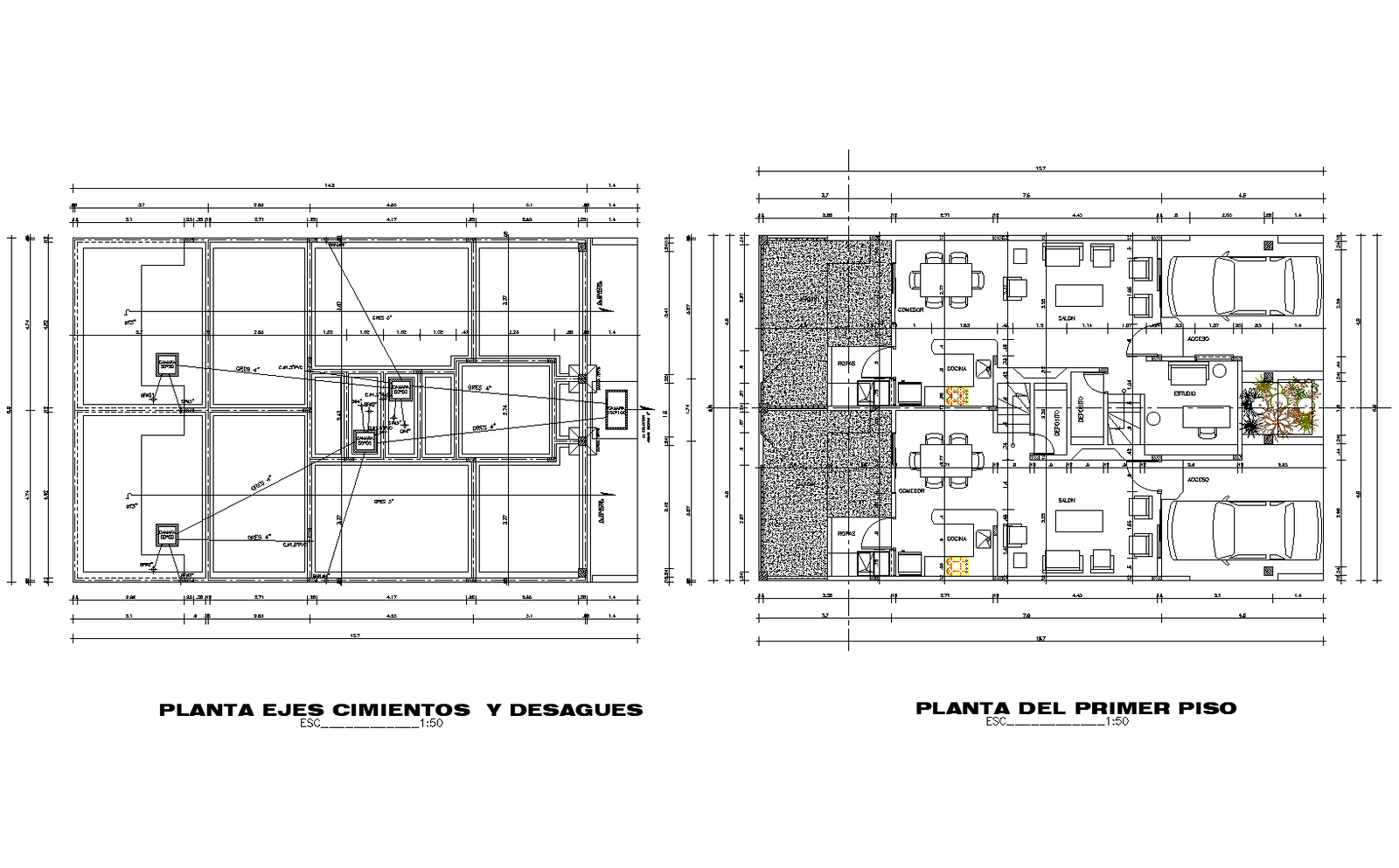 Plan of multi-family loft. Plan with detailing of seating, wash area, pantry, plantations. Plan with detailing and elevation with plant cover in 2Dplan.