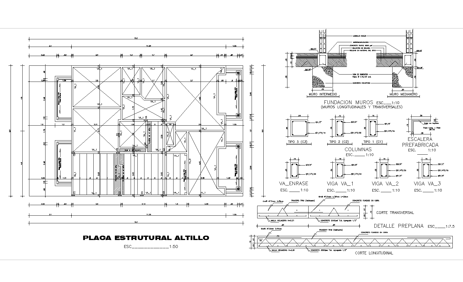 Detailing of multi-family loft plan. 2D plan with elevations is shown with detailing. Columns are detailed with different sections.