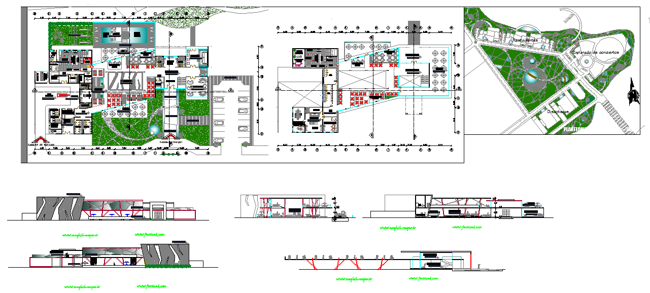 This Restaurant Building Detail layout features a complete architectural design, including floor plans, sections, elevations, and site layout. The drawing showcases an elegant combination of dining areas, service spaces, kitchen planning, and landscaped surroundings. Each part of the design focuses on smooth circulation, aesthetic appeal, and practical functionality suitable for modern hospitality environments.