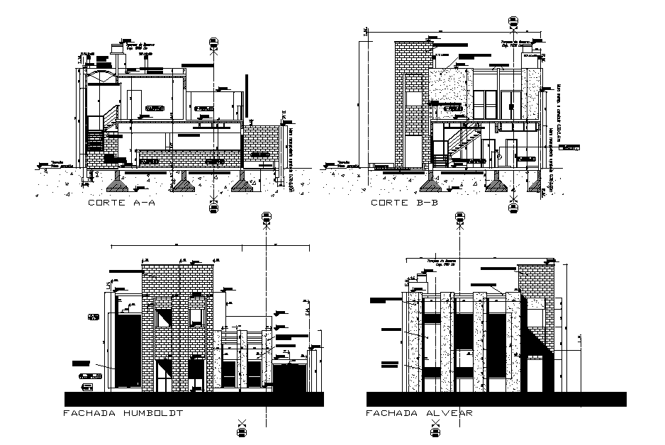 Posh bungalow elevation design, Front elevation and section detail dwg file, front elevation of a bungalow is shown, sectional details, staircase view