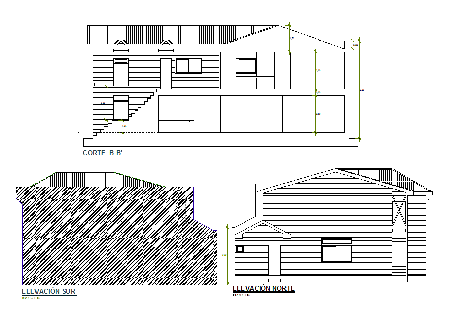 Bungalow elevation dwg file, big scale architectural project, front and all sides of elevation is shown