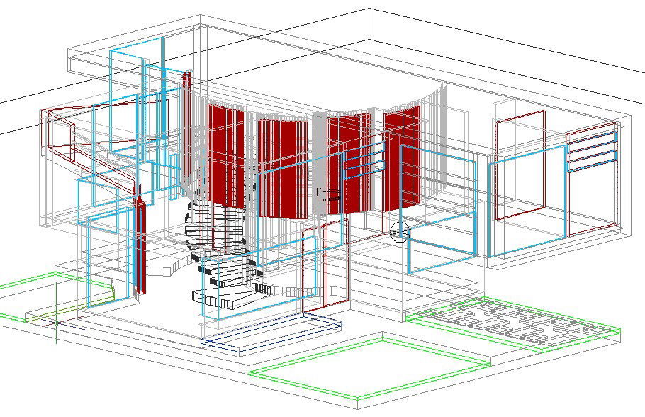 Minimalist housing 3 d house plan detail dwg file, including stair detail, front elevation view detail, furniture detail in door and window detail, etc.
