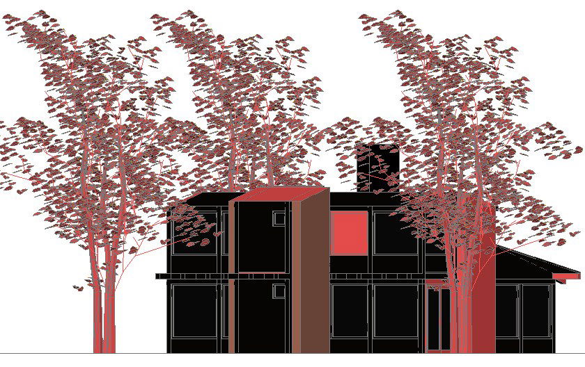 Forest home 3 d house plan detail dwg file, with landscaping detail in tree and plant detail, front elevation view detail, etc.