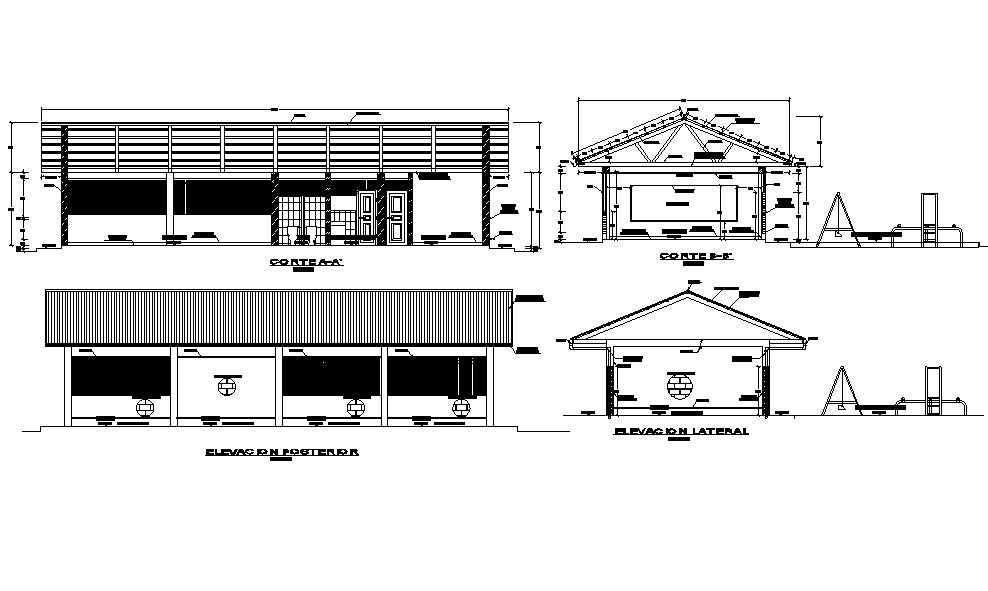 Section Construction class room primary level for educative institution plan detail dwg file, front elevation detail, side elevation detail, section A-A’ detail, section B-B’ detail, dimension detail, naming detail, etc.