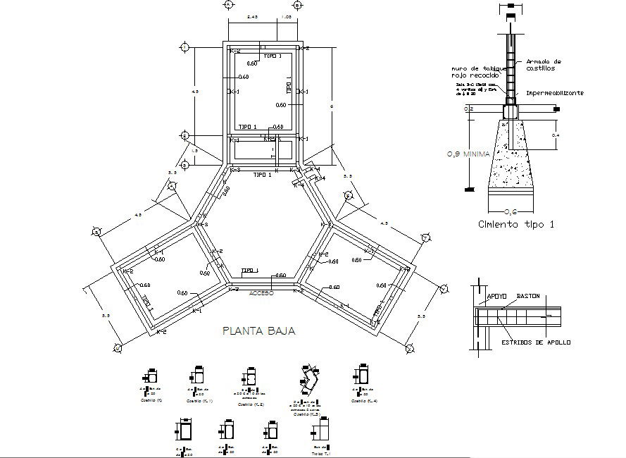 Column plan and section detail dwg file, with dimension detail, center line plan detail, reinforcement detail, etc.