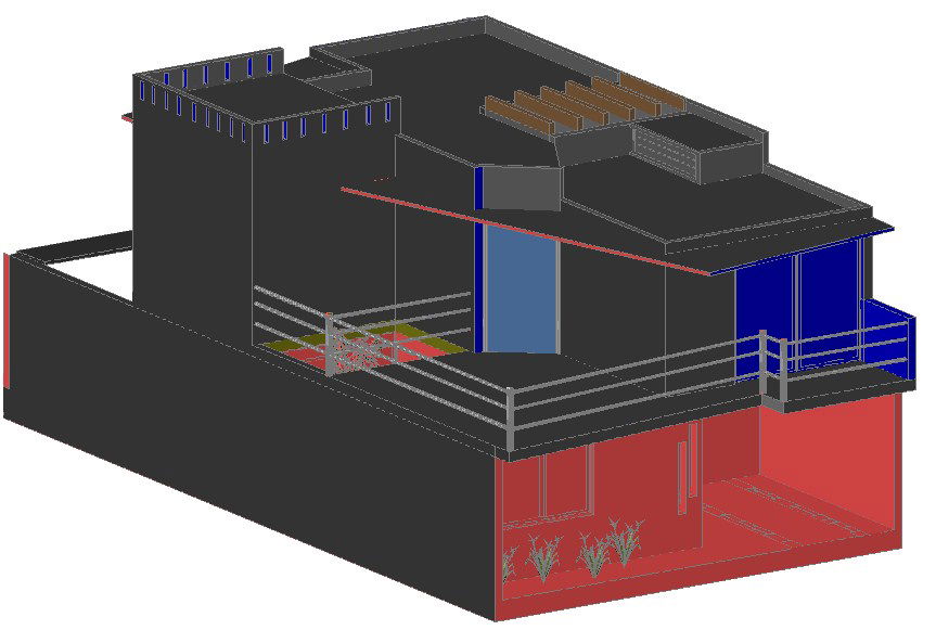 House 3 D plan detail dwg file, with front elevation view detail, balcony reeling detail, pergola detail, plant detail, etc.