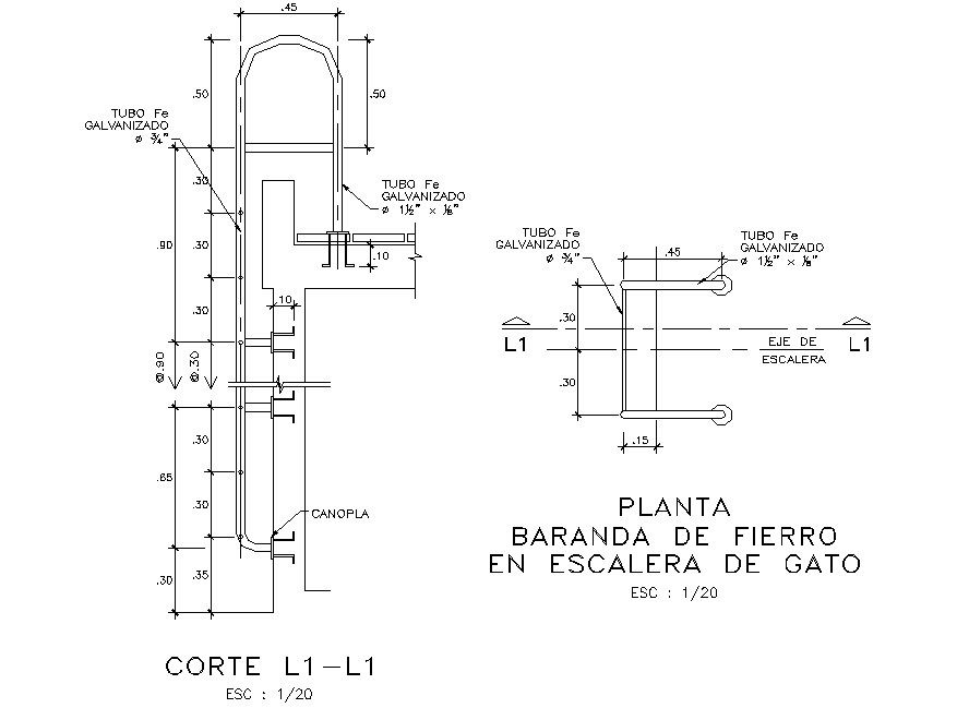 Iron railing plant cat ladder detail dwg file, with dimension detail, naming detail, section line detail, scale 1:20 detail, etc.