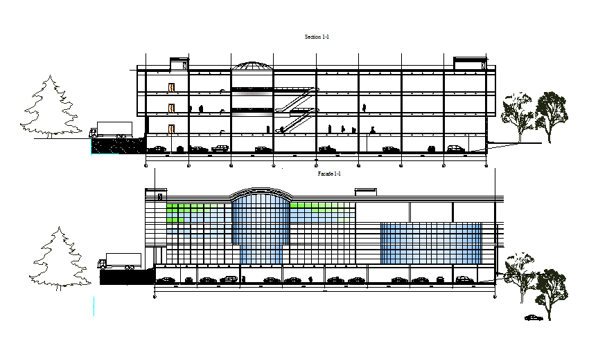 Big shopping center detail, glass building structure details, Front elevation and section detail dwg file, front elevation of a building is shown, sectional details, staircase view
