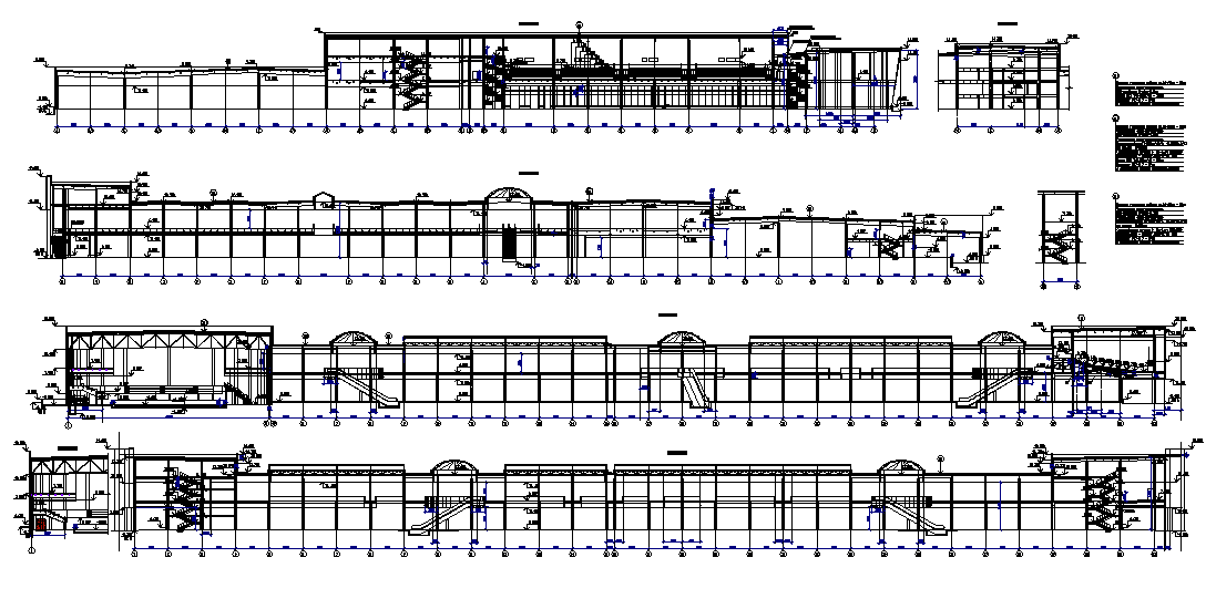 Front elevation of a shopping center, Front elevation and section detail dwg file, front elevation of a shopping center is shown, sectional details, staircase view
