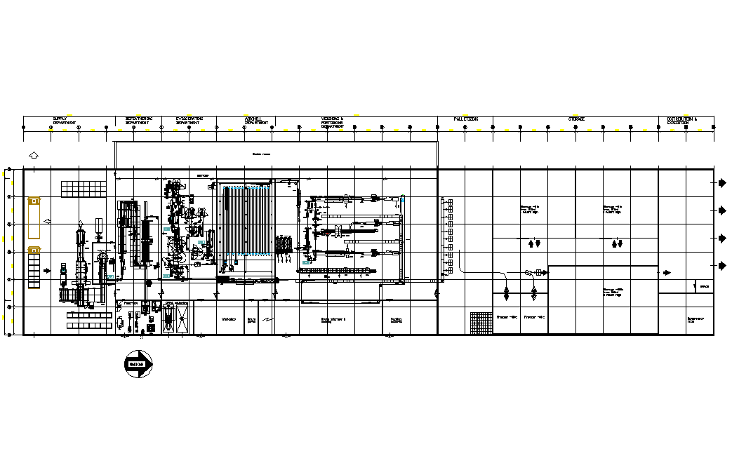 Processing chicken plant 6000 birds per hour plan detail dwg file, with north direction detail, centre line plan detail, centre line plan detail,