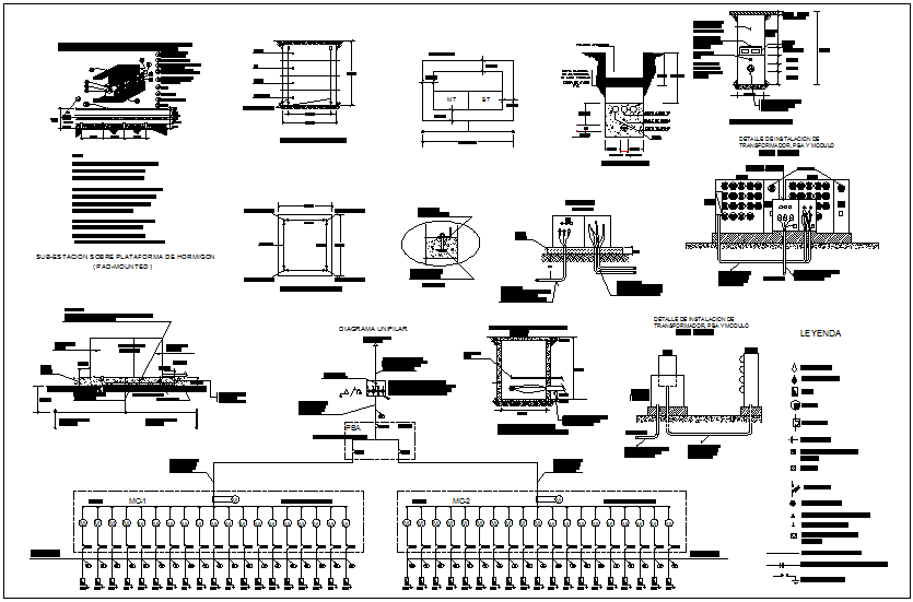 view of electrical for sub station with electrical diagram view, transformer view with its foundation,PCB view and cable foundation with electrical legend in view.