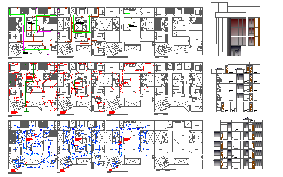 This Hotel Detail Plan project presents a complete architectural layout designed to support accurate planning, circulation management, and technical coordination. The drawing includes multi-floor room arrangements, lobby layouts, service corridors, housekeeping zones, guest rooms, lift cores, staircases, and emergency exits. The DWG also displays fire exit routing, electrical wiring paths, plumbing lines, and HVAC passages clearly marked with dedicated colors for easy interpretation. These details help architects and engineers understand spatial distribution and building services within a functional hotel environment.
