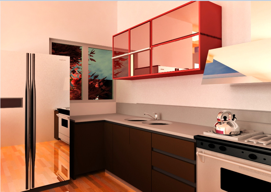 Kitchen design dwg file 3D image view of a kitchen , there is a detailing of a platform, fridge etc , image detailing