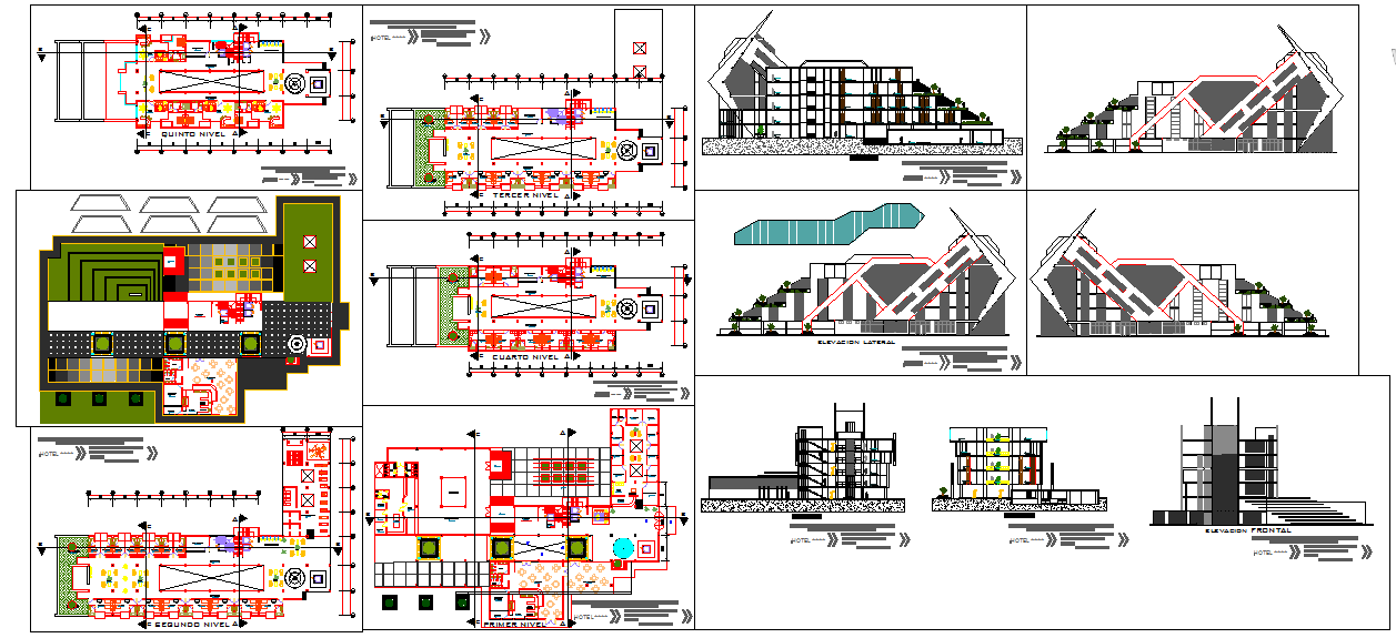 Hotel Design Plan with Floor Levels Sections and Elevation DWG