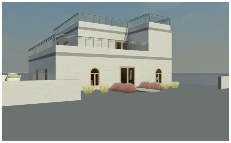 This is a modern house. It is very simple and sober house. There is a coffee table on the balcony. This is a nice house design.