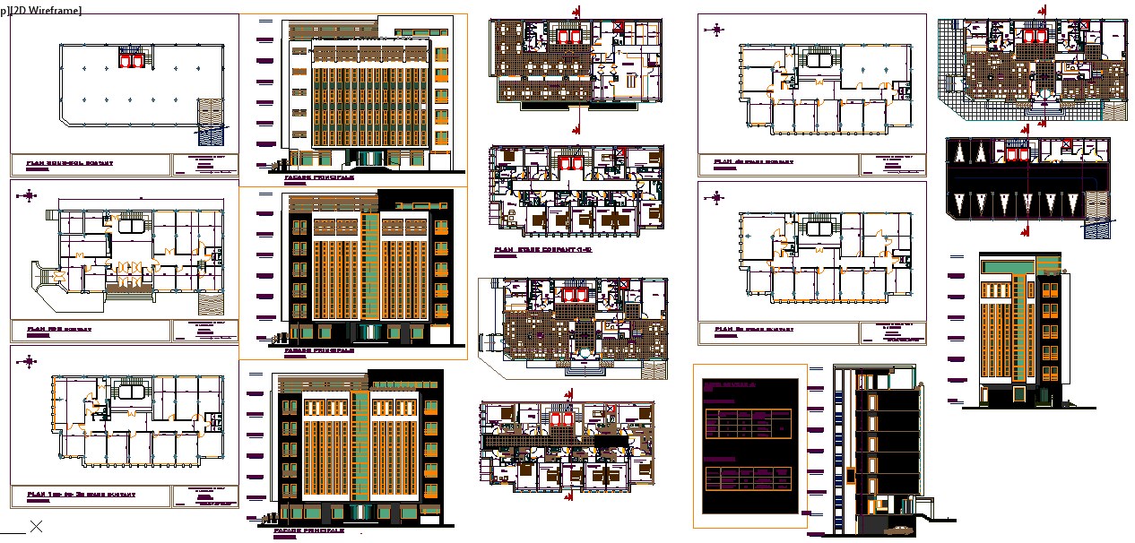 Additionally, the project includes colored elevations and detailed sectional views that showcase façade elements, window alignment, building height, and structural components. These drawings enhance clarity in understanding vertical connections, service shafts, and building mass. Interior sections further display room proportions and internal arrangements essential for construction and design coordination. This DWG plan is ideal for architects, civil engineers, and hospitality designers working on modern hotel developments, offering a complete reference for planning, presentation, and execution.