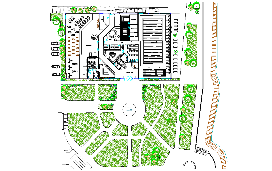 Wellness and spa complex, layout plan of a site dwg file, here this auto cad file contains top view layout plan of a site, showing plantation , swimming area etc