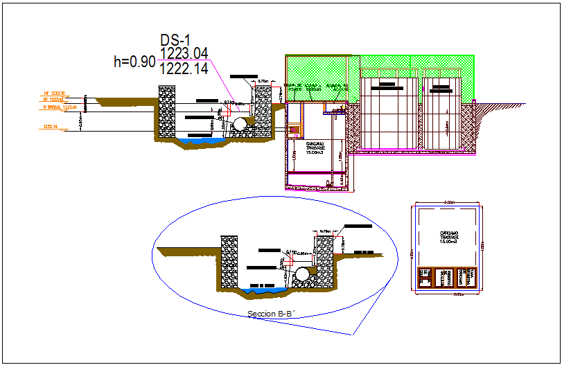 wall,wall support,stone view,tank position with valve view and related sectional detail