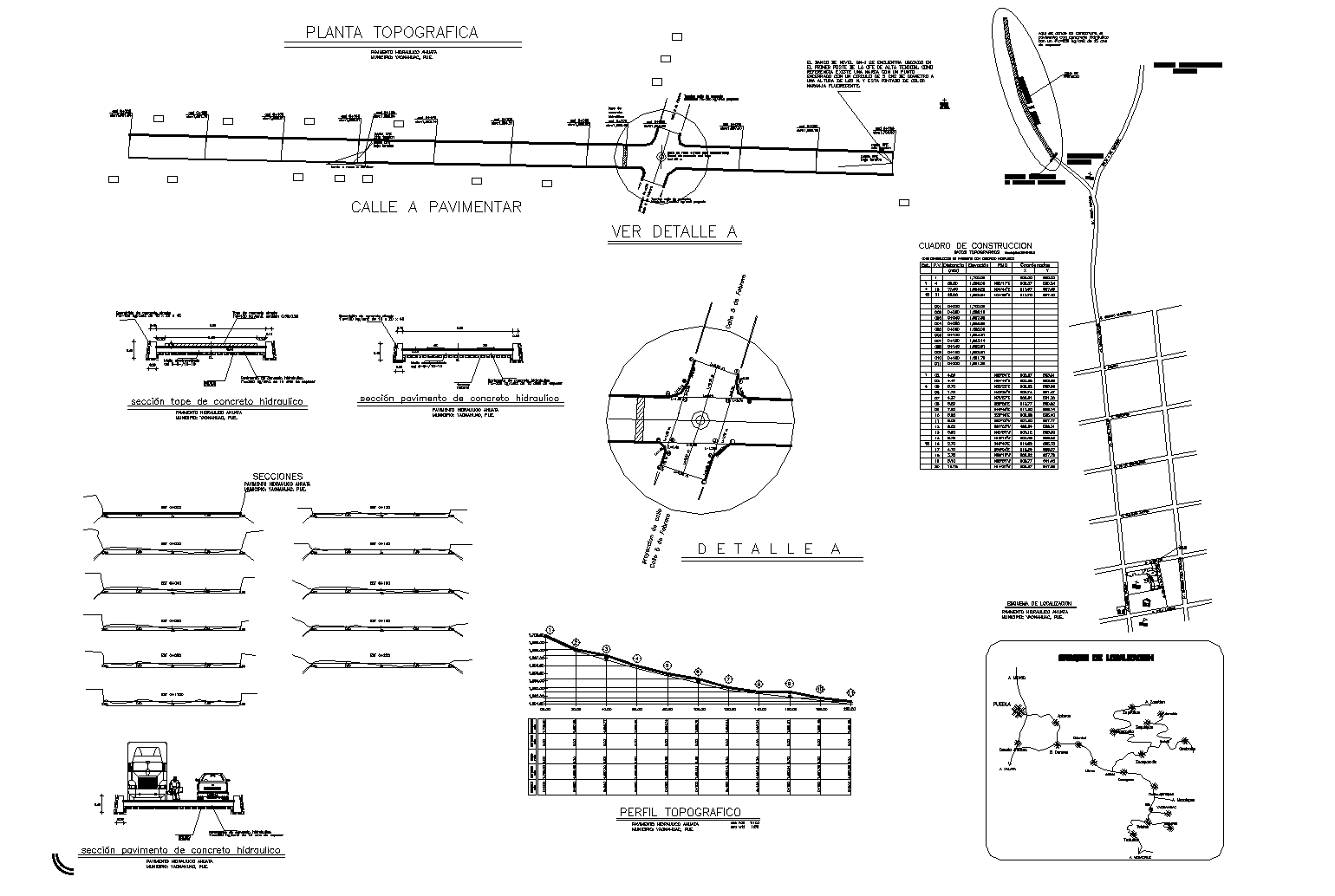 Hydraulic concrete pavement to graphic profile plan. Sections with different size and construction plan with detail. Graphs with different parameters