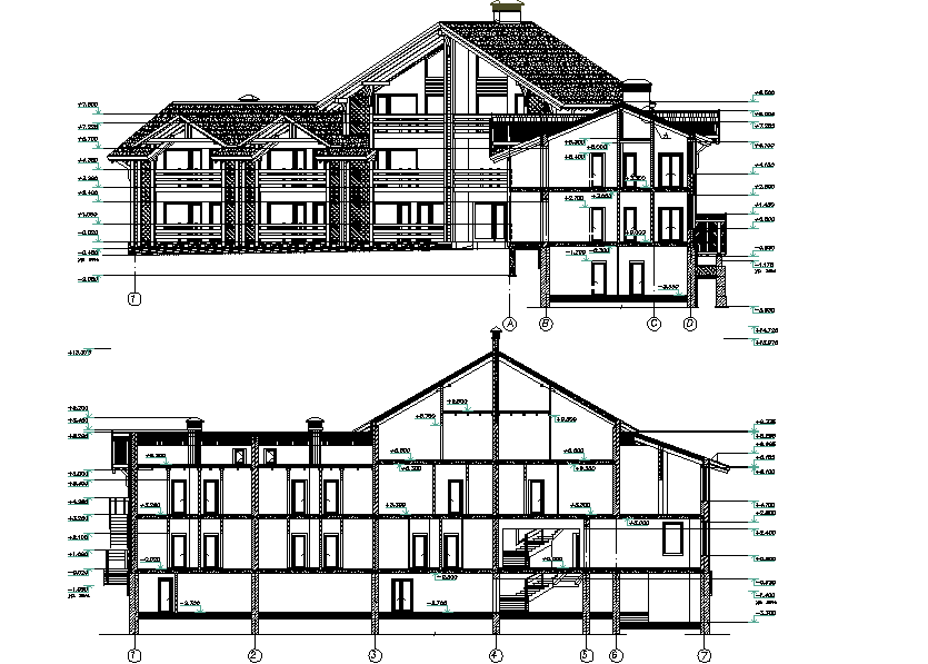 Hotel and resort elevation, front elevation detail of hotel, wooden material detailing