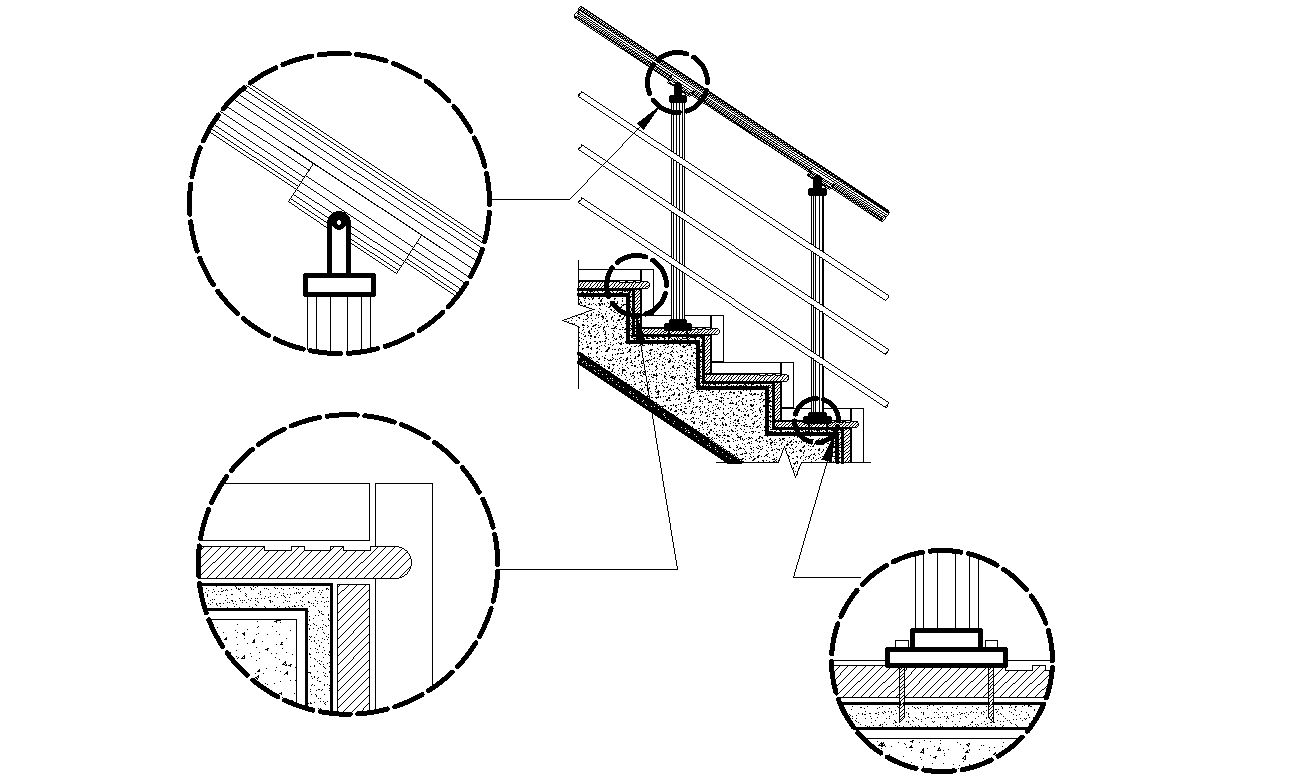 Stairs detail-risers and hand rails. 2D plan with detailing. Minor or minute details is shown near with the arrow to indicate.