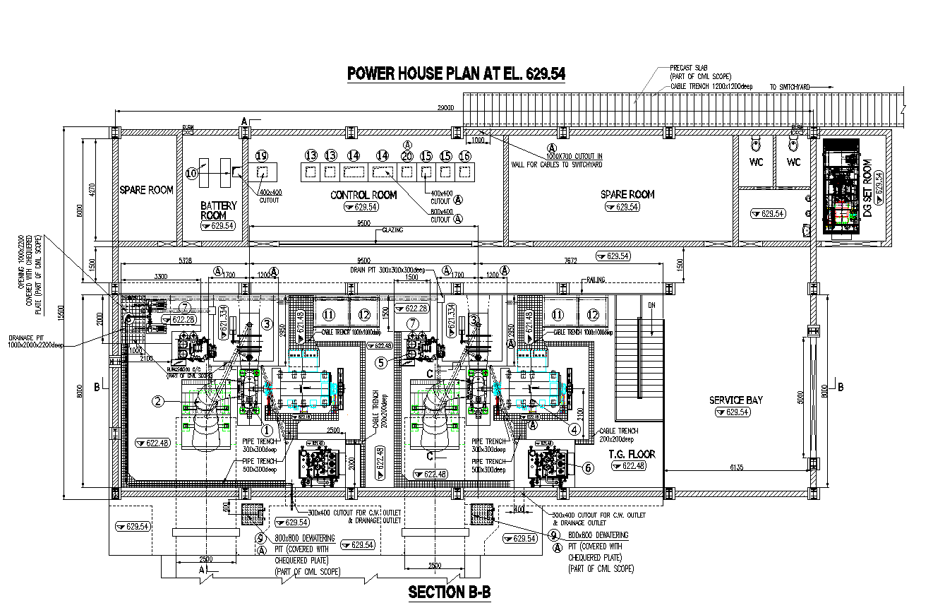 The powerhouse of a mini hydro-electric power plant. The plant includes spare room, control room, battery room, service bay, washroom, D.G set room, T.G floor, etc., Every room is mentioned with their perspective detailing.