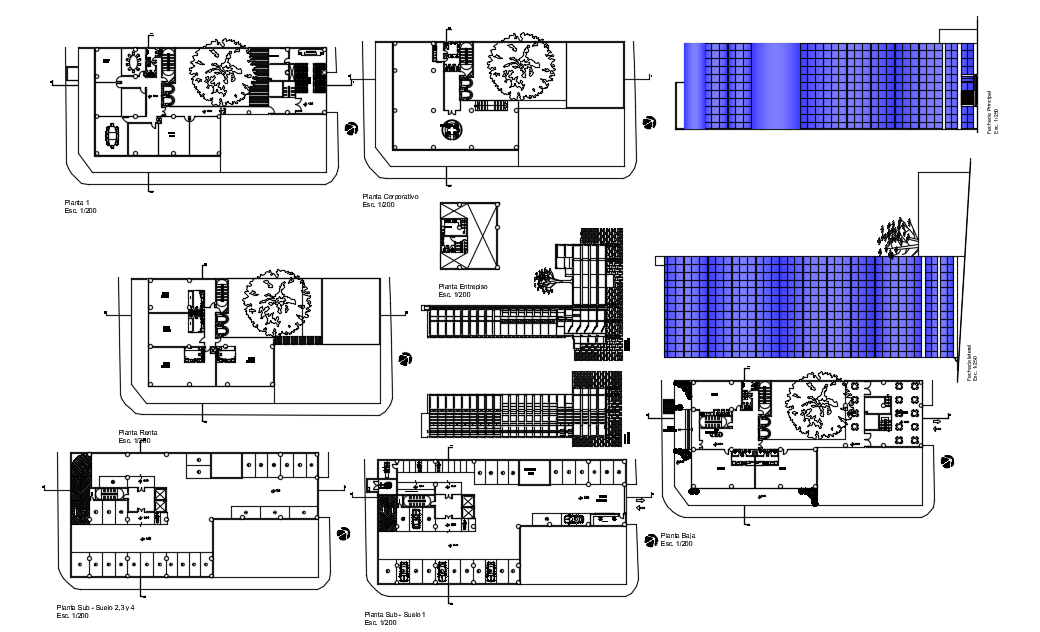 Corporate building dwg file. The architecture layout plan of all level floor along of furniture detailing, section plan, construction plan, structure plan and elevation design of Corporate building.
