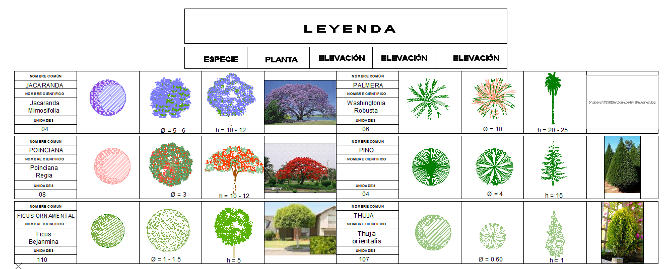 This Tree Block collection provides a detailed set of landscape symbols, including plan views, elevation views, and scientific name references for multiple species. The drawing includes Jacaranda, Poinciana, Ficus Benjamina, Washingtonia Robusta, Pino, and Thuja Orientalis. Each species is shown with canopy diameter, height, and visual representation to support accurate integration into architectural and landscape drawings. The layout also includes image references that help designers understand the real appearance of each tree for more realistic planning.