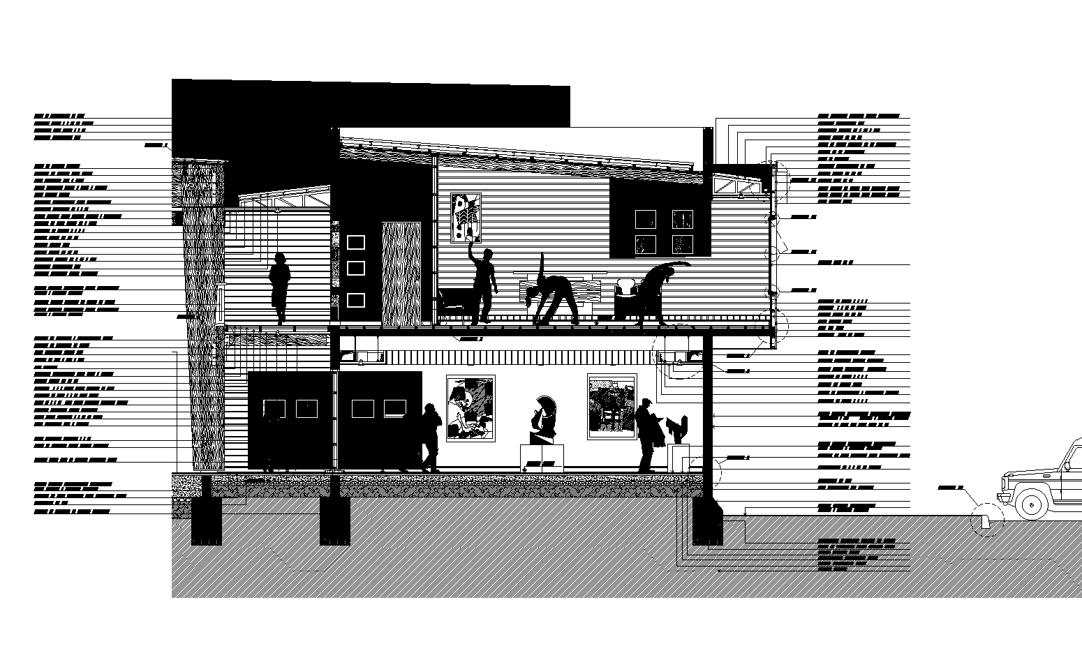 Cultural center plan. Front elevation of a dimensional plan. Floors indicated different utilizations. It may be an office, fitness area, etc.,