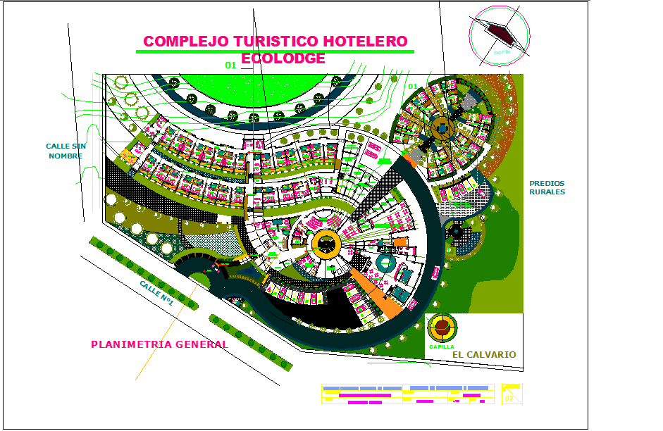 The drawing also highlights the surrounding road connections, rural boundary markers, and chapel location, making it a comprehensive reference for site planning. Landscaping elements, contour lines, vegetation layouts, and pedestrian routes enhance the overall design clarity. This DWG file is ideal for architects, planners, and hospitality designers who need an organized and visually strong master plan. The details help support concept development, design presentation, and construction coordination for modern hotel and ecolodge projects. The combination of spatial flow, greenery, and architectural zoning makes this plan suitable for sustainable tourism design.