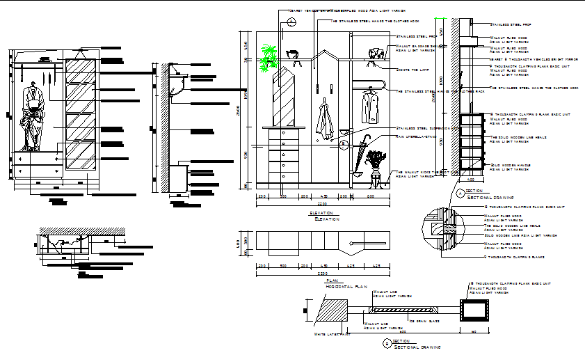 Cupboard detail dwg file, including plan, elevation and section detail, dimension detail, naming detail, landscaping detail in plant detail, etc.