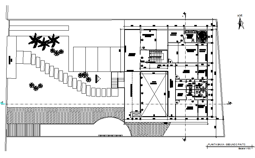 North direction home plan detail dwg file, with section line detail, landscaping detail in plant and tree detail, etc.