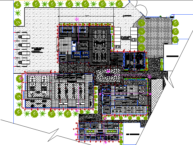 Production resource center hydro biological plan detail dwg file, with truck parking detail, lanspeping detail in tree and plant detail, naming detail, etc.