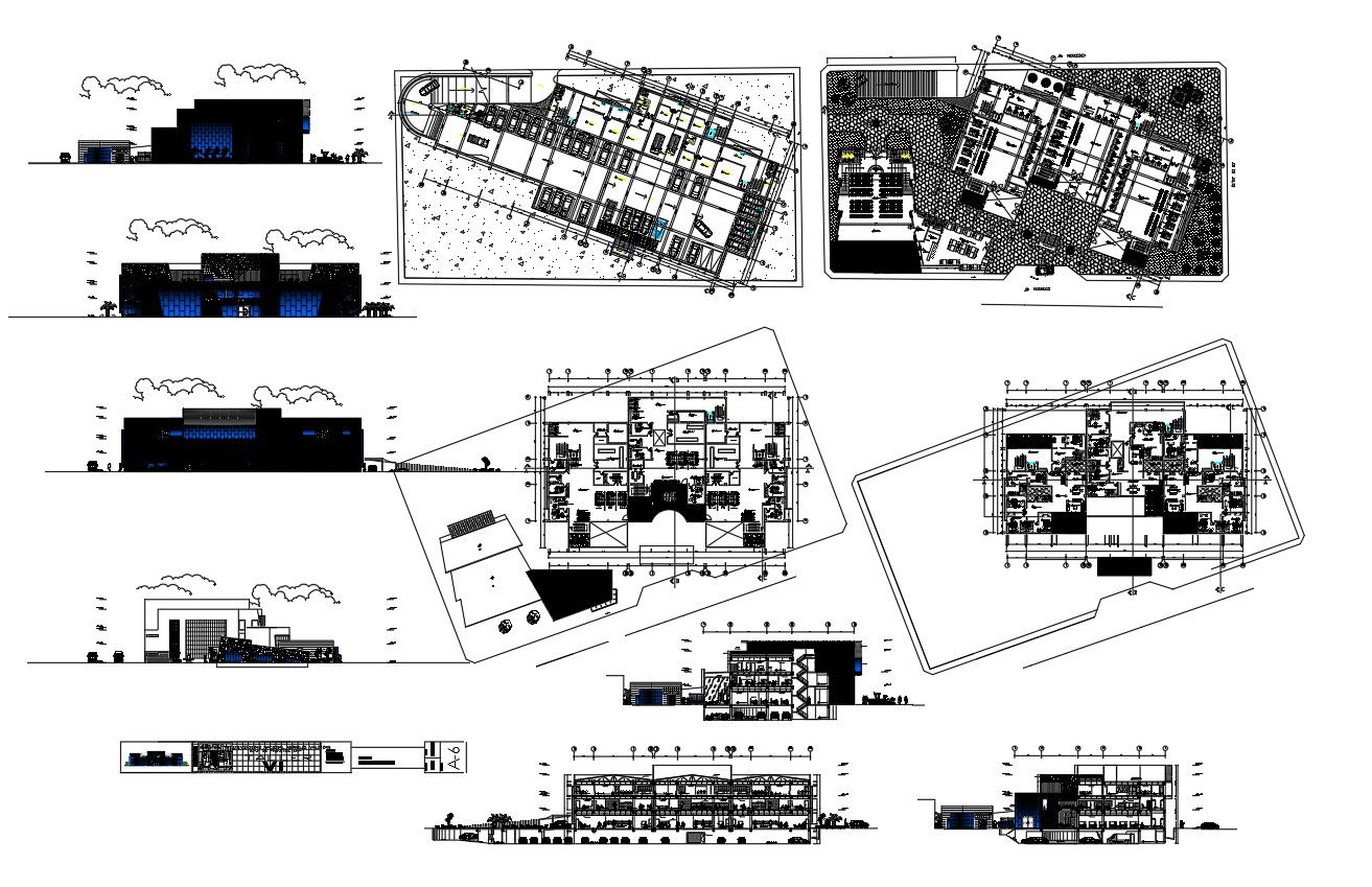 Banking center layout dwg file.Includes wall construction, section details, beam and column elevation, doors and window layout, roof plan, staircase view, landscaping, material details and much of Banking center.