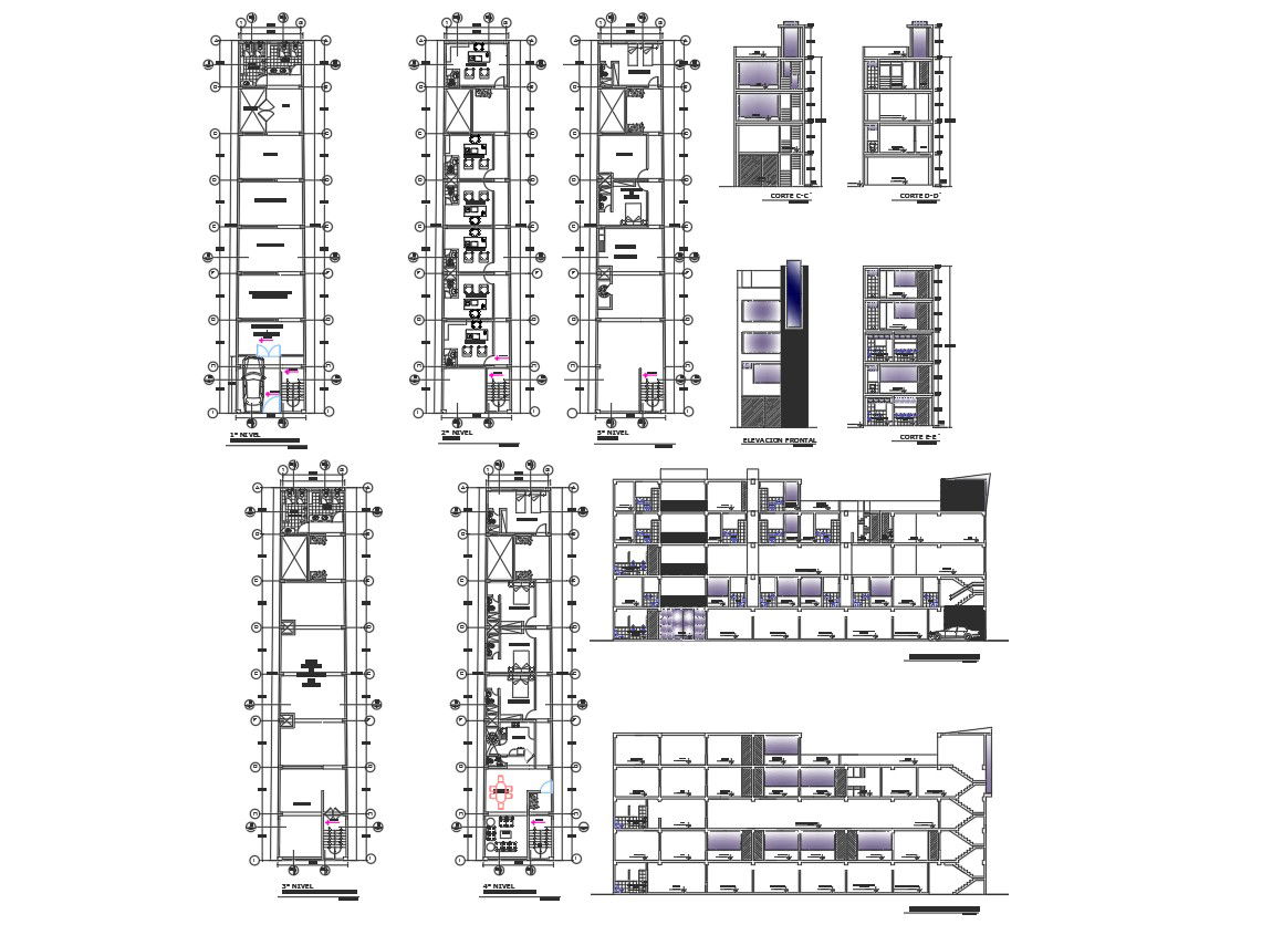 Multipurpose Building dwg file. Architecture Layout that includes wall construction, section details, beam and column elevation, doors and window layout, roof plan, staircase view, landscaping, material details and much of Multipurpose Building.
