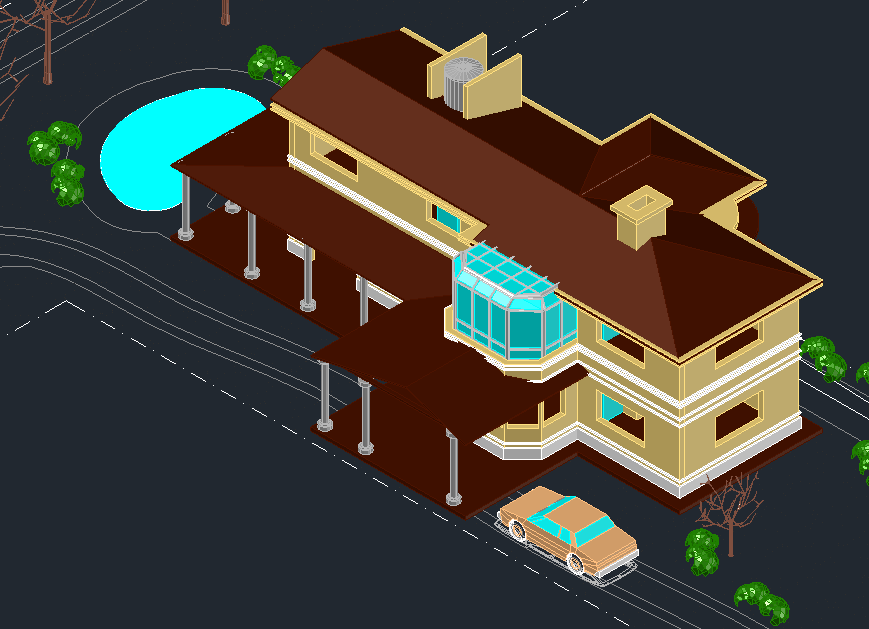 3 D house plan detail dwg file, with landscaping detail in tree and plant detail, swimming pool detail, car parking detail, chimney detail, etc.
