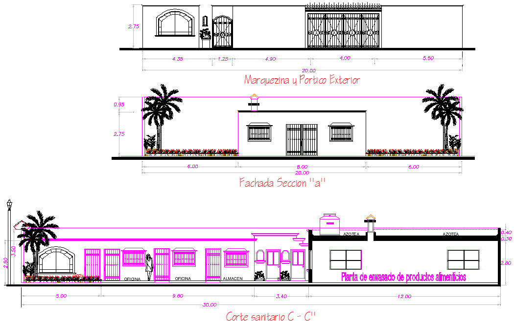 Elevation and section Treatment plant for packaging of food products detail dwg file