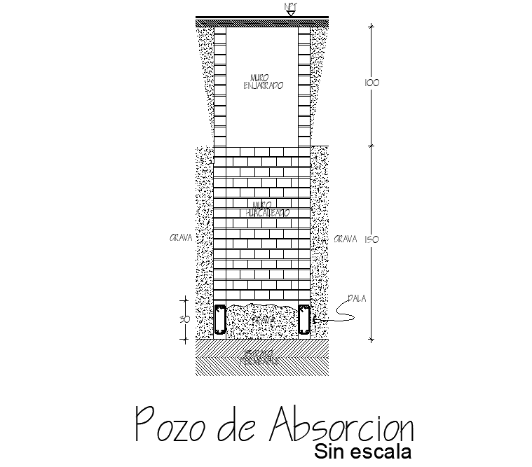 Absorption well section detail dwg file, including brick wall detail, dimension detail, naming detail, etc.