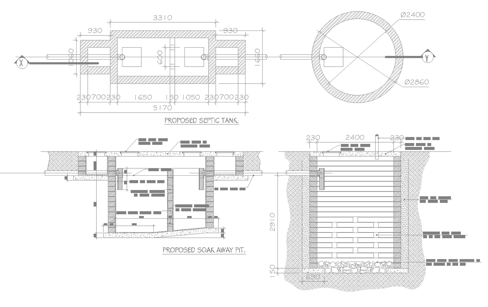 Guest house plan. Top view plan with detailed sections in 2D. Each section is detailed with dimensions.