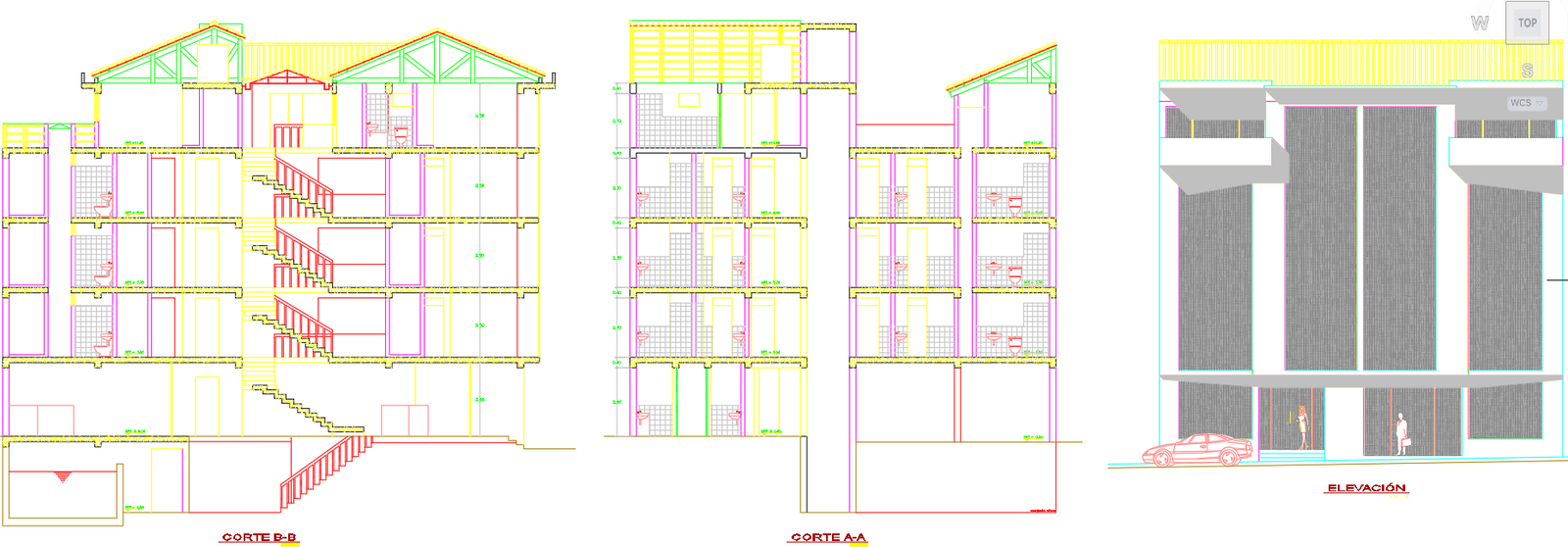 Elevations and sections illustrate the vertical arrangement of rooms, floor heights, balcony projections, façade treatment, and structural alignment of the hotel. The plans clearly mark spacious banquet halls, restaurant seating arrangements, and a well-planned conference hall, making the design suitable for a three-star hospitality project. Interior zoning, room clusters, and service circulation are well represented, providing a practical reference for architects, interior designers, and engineers working on hotel development. The detailed organization of spaces ensures efficient movement, functional clarity, and a comfortable guest experience within a professionally drafted multi-floor hotel layout.