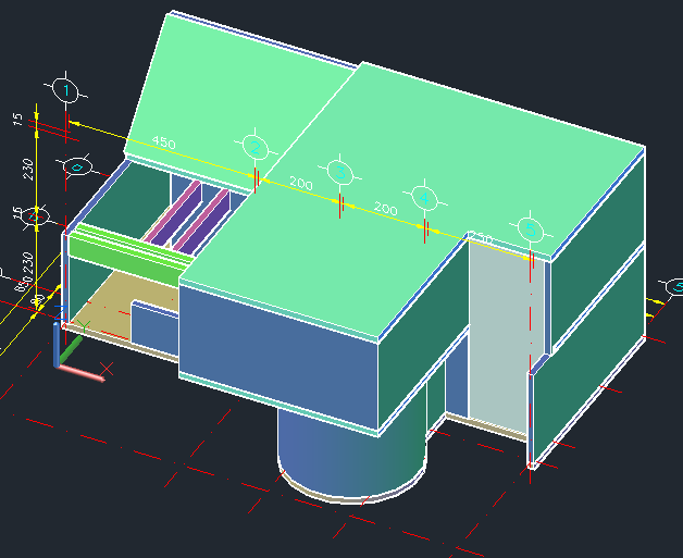 Front 3 D home plan detail dwg file, including dimension detail, naming detail, etc.