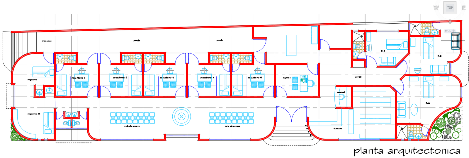 This small clinic design plan DWG presents a complete architectural layout including consultation rooms, examination areas, waiting spaces, reception counters, staff rooms, and treatment spaces organized in a compact and functional arrangement. The drawing clearly displays internal walls, door positions, furniture placements, sanitary zones, and circulation paths to support efficient patient movement. The architectural floor plan also integrates outdoor green pockets and curved façade elements, creating a more welcoming healthcare environment. Thoughtfully designed consultation booths and patient seating arrangements help maintain privacy while improving operational flow within the clinic.