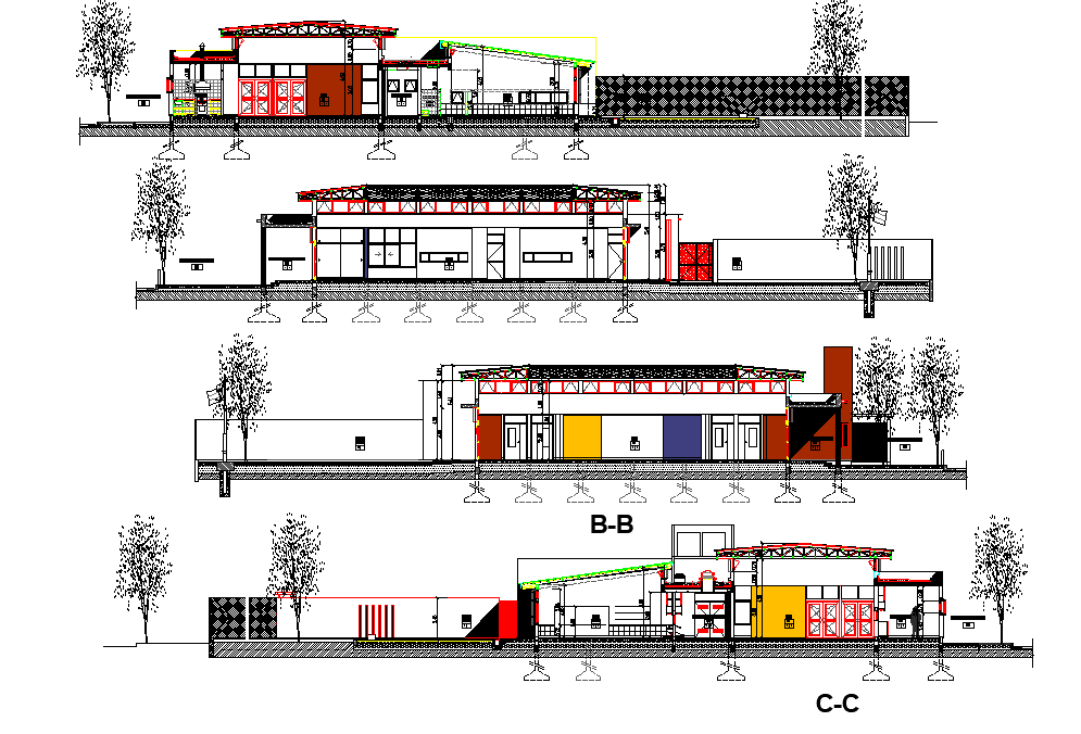 Club house section plan detail dwg file, incluiding landsceping detail in tree detail, naming detail, dimension detail, furniture detail in door and door detail, etc.