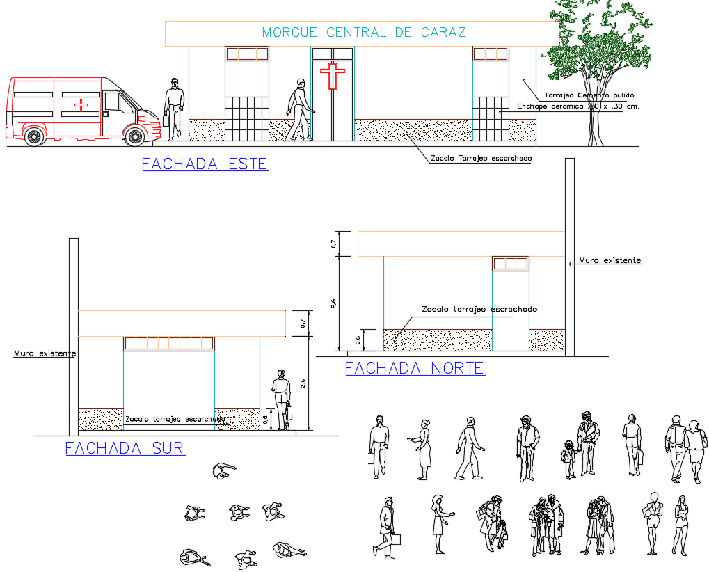 In addition to the floor plan, the file includes detailed elevation designs from the east, south, and north sides, showing façade composition, window proportions, roofline treatment, and exterior finishing elements. An ambulance access illustration and human figure blocks offer better visualization of scale and functional use. These clinic elevations highlight the structural clarity and external appearance of the building. This DWG is ideal for architects, interior designers, and engineers looking for an accurate reference of clinic layout planning, structural detailing, and façade presentation. The combination of plan, section, and elevation elements makes this drawing a complete guide for designing a compact and functional healthcare facility.