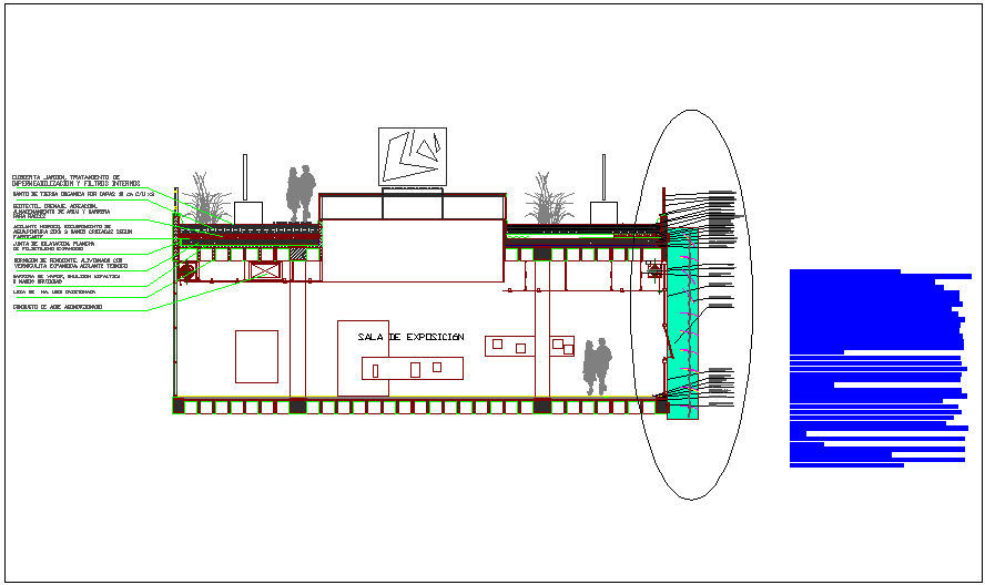 Architectural detail view of yard deck dwg file in side elevation with view of wall and area of showroom,filter and air condition area view.