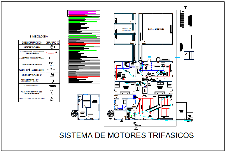 Three phase motor system with electrical view and its legend for industrial canal view dwg file