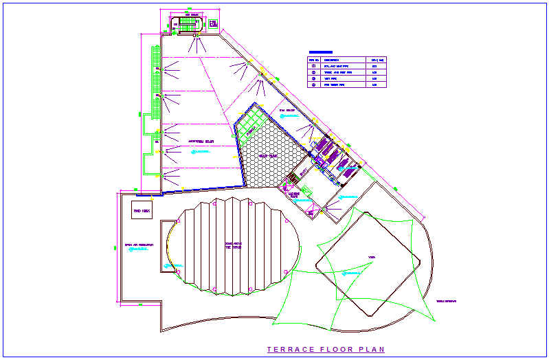 Architectural view of terrace plan for club house with pipe schedule table dwg file