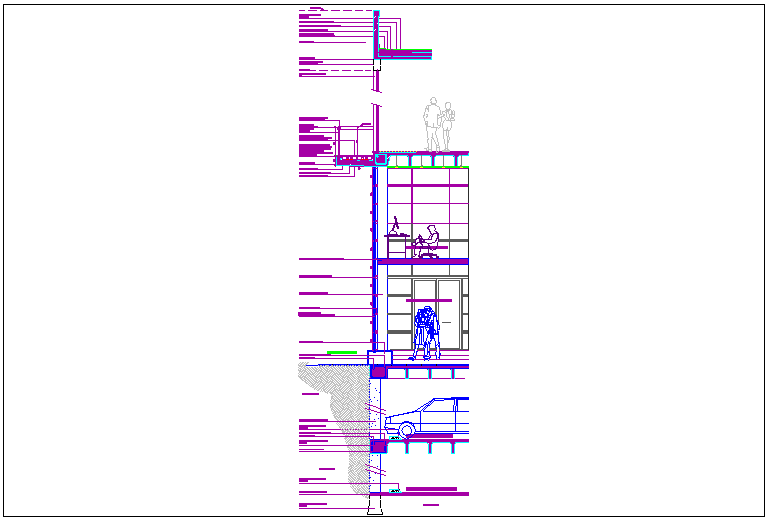 Construction section view of building dwg file in section view with wall,wall support,floor,floor level,Column view with its foundation view and block of couple on terrace area with necessary construction detail and dimension.