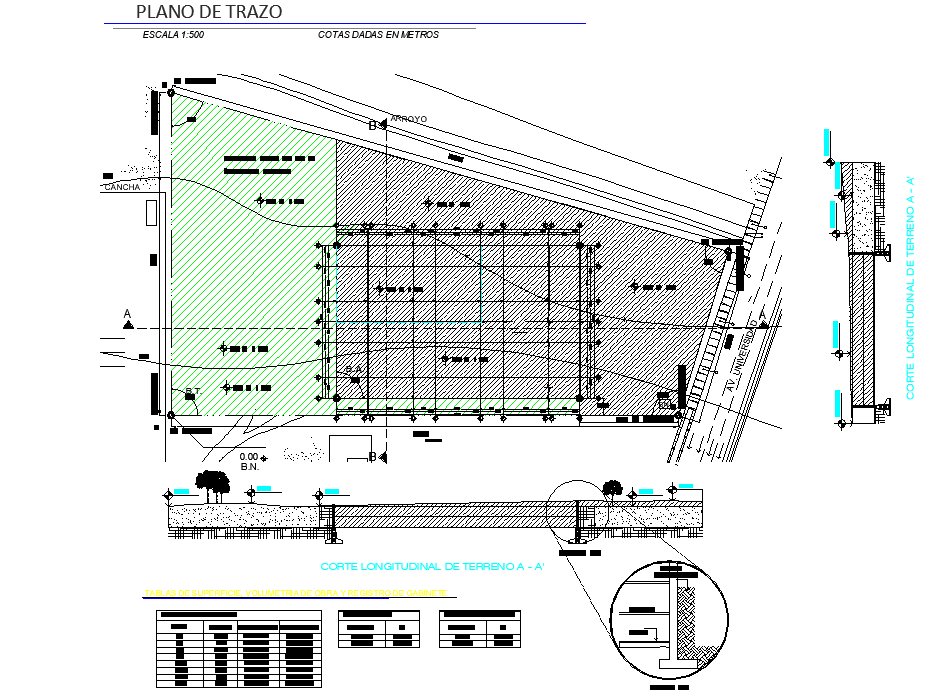 Stroke plan detail dwg file, with section line detail, radius detail, naming detail, dimension detail, section longitudinal detail, etc.
