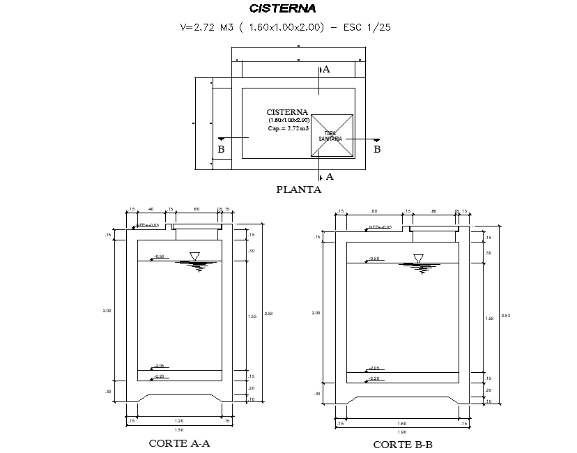 plan and section tank detail dwg file, including section line detail, section A-A’ detail, section B-B’ detail, etc.